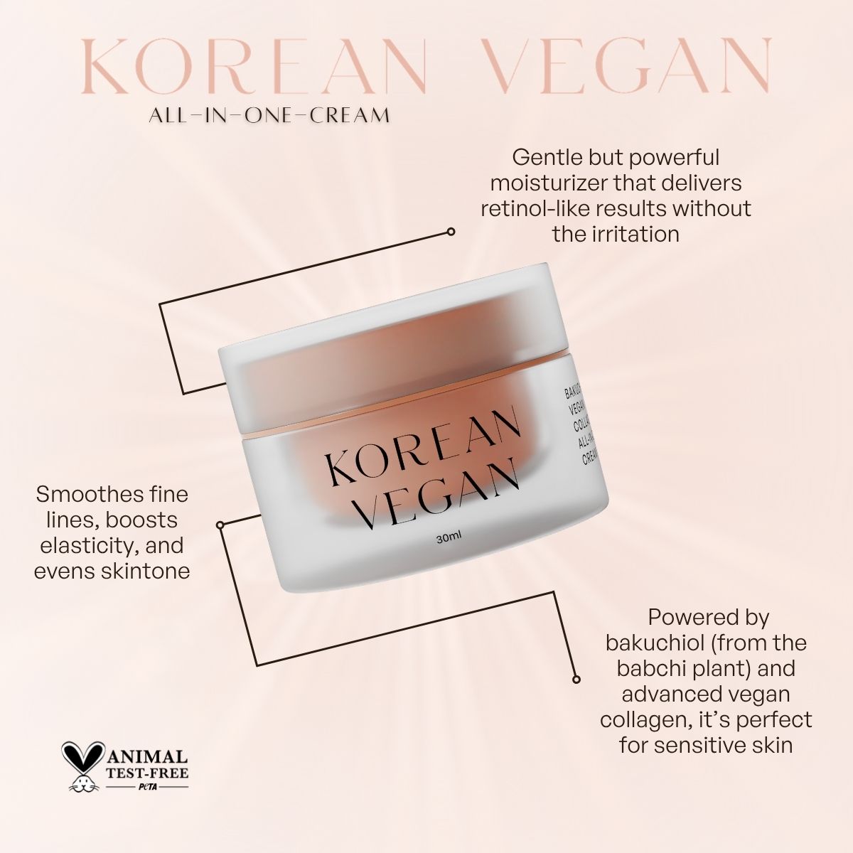 Our Bakuchiol + Vegan Collagen All-in-One Cream is a gentle, powerful moisturizer that delivers retinol-like results — smoothing fine lines, boosting elasticity, and evening tone — without irritation. Powered by bakuchiol (from the babchi plant) and advanced vegan collagen, it’s perfect for sensitive skin. PETA Certified Cruelty-Free.
